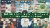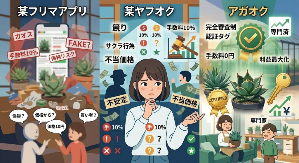 | 比較項目 | アガオク(専門) | 某フリマアプリ | 某オークション |